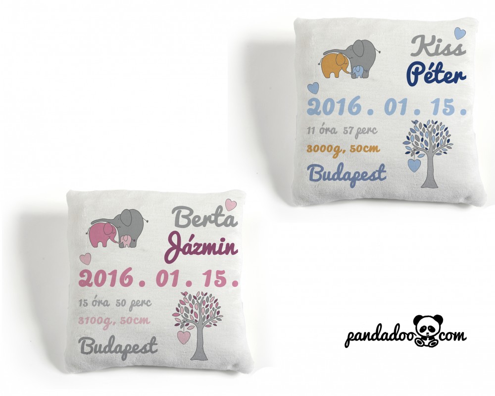 A pihe-puha elefántok párna mintájába a baba nevét és születési adatait is beillesztjük. Tökéletes ajándék baba születésekor, keresztelőre, szülinapra... A baba örömét talán csak az anyuka öröme múlja majd felül. :) Kedves elefántok szeretve őrzik a család melegét és a párna kisgazdáját is.